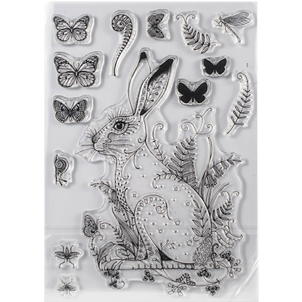 Pink Ink Designs A5 Clear Stamp Set Meadow Hare is a set of unique, hand-drawn stamps suitable for papercrafts, home decor and mixed media art. This Pink Ink Meadow Hare stamp differs from their stamp called "Hare" since that stamp has a face-on view of the hare, whereas in this set you get a profile view instead. Contains 14 stamps. Made in the UK..